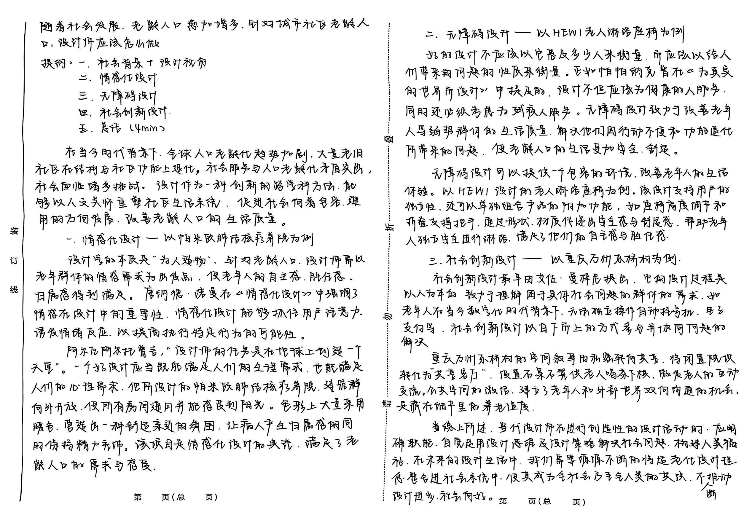随着社会发展,老龄人口感加增多,针对城市社区老龄人 口,设计师应该怎么做 二、无障碍设计--以HEWI老人淋浴座椅为例 提纲:一.社会背景+设计视角 好的设计不应该以它恶及多少人来衡量,而应该以给人 =.情感化设计 们带来的问题的性质来衡量。正如帕帕纳克普在《为真实 三.无障碍设计 的世界而设计》中提及的,设计不但应该为健康的人服务。 四、社会创新设计 同时还必须考虑为残疾人服务。无障碍设计致力于改善老年 五、总结(4min) 人等弱势群体的生活质量,解决他们因行动不便和功能退代 在当今时代背景下,全球人口老龄化趋势加剧,大量老旧 所带来的问题,使老龄人口的生活更加安全,舒适。 社区在结构与社区能上退化,社会服务与人口老龄化矛盾先出, 无障碍设计可以提供一个包容的环境,改善老年人的生活 社会面临诸多挑战。设计作为一种创新的跨学科方法,能 够以人文关怀重塑社区生活系统,促进社会向着包容,通 体验。以HEWI设计的老人淋浴座椅为例。该设计支持用户的 用的方向发展,改善老龄人口的生活质量。 独立性,还可以单独组合产品的附加功能,如座椅高度调节和 装 折叠支撑把手,通过形状,材质传递出安全感与舒质感,帮助老年 一、情感化设计-以帕米欧肺结核疗养院为例 人独立安全进行淋浴,满足了他们的自主感与胜任感 订 设计学的本质是“为人造物”,针对老龄人口,设计师需以 三、社会创新设计 --以重庆万州东桥村为例, 老年群体的情感需求为出发点,使老年人的自主感,胜任感 线 社会创新设计最早由艾佐,曼梓尼提出,它的设计过程是 归属感得到满足。唐纳德.诺曼在《情感化设计》中强调了 以人为本的致力于理解困于具体社会问题的群体的需求,如 情感在设计中的重要性,情感化设计能够抓住用户注意力 老年人不当今数字化时代背示下,无法独立操作自动托号机,子 诱发情绪反应,以提高执行特定行为的可能性。 支付等,社会创新设计以自下而上的方式参与并协同何起的 阿尔瓦阿尔托曾言,“设计师的任务是在地球上创造一个 解决 天堂”。一个好设计应当既能满足人们的生理需求,也能满足 重庆万州东桥村的空间叙事由私密转向共享,将闲置院坝 人们的心理需求,他所设计的帕米欧肺结核疗养院,建筑群 转化为“共享客厅”,设置石果石凭供老人喝茶下棋,激发老人的互动 交流。公共空间的激活,建立了老年人和外部世界双向沟通的机会, 向外开放,使所有房问通风并能感受到阳光。色彩上大量采用 是藏在细节里的养老温度, 暖色,营造出一种舒适亲近的氛围,让病人产生归属感的同 综上所述,当代设计师在进行创造性的设计活动时,应明 时保持精力充沛。该项目是情感化设计的典论,满足了老 确职能,自觉运用设计思维及设计策略解决社会问题,构建人类福 人口的需求与感受 祉,在未来的设计生活中,我们需要源源不断的将造老化皮叶理 念整合进社会系统中,使其成为全社会乃至全人类的共识,不推动 第 页(总 页) 设计进步,社会向好。第 页(总 页) 断