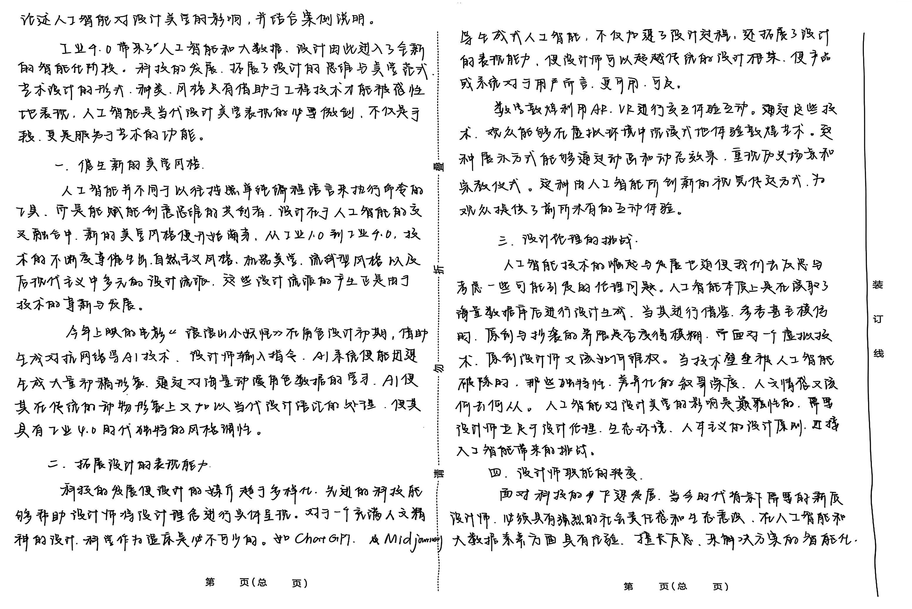 高效化与个性化,以更好应对复杂地社会系统问题。通 : 过设计创新+技术创新实现突破式创新,为“新时 代的科技设计发展构建新的方法论 综上所述。人工智能等技术的发展既是机遇,也是 挑战,重新定义了设计师的职能,是人类智慧与人工智能 的协同设计,根要在新时代下设计出好的作品,必须要 将高新技术与人类的深度思考有机统一,以求设计将 须健康的发展,以全新的美学范式增添设计活力。 装 订 线 第 页(总 页) 第 页(总 页)