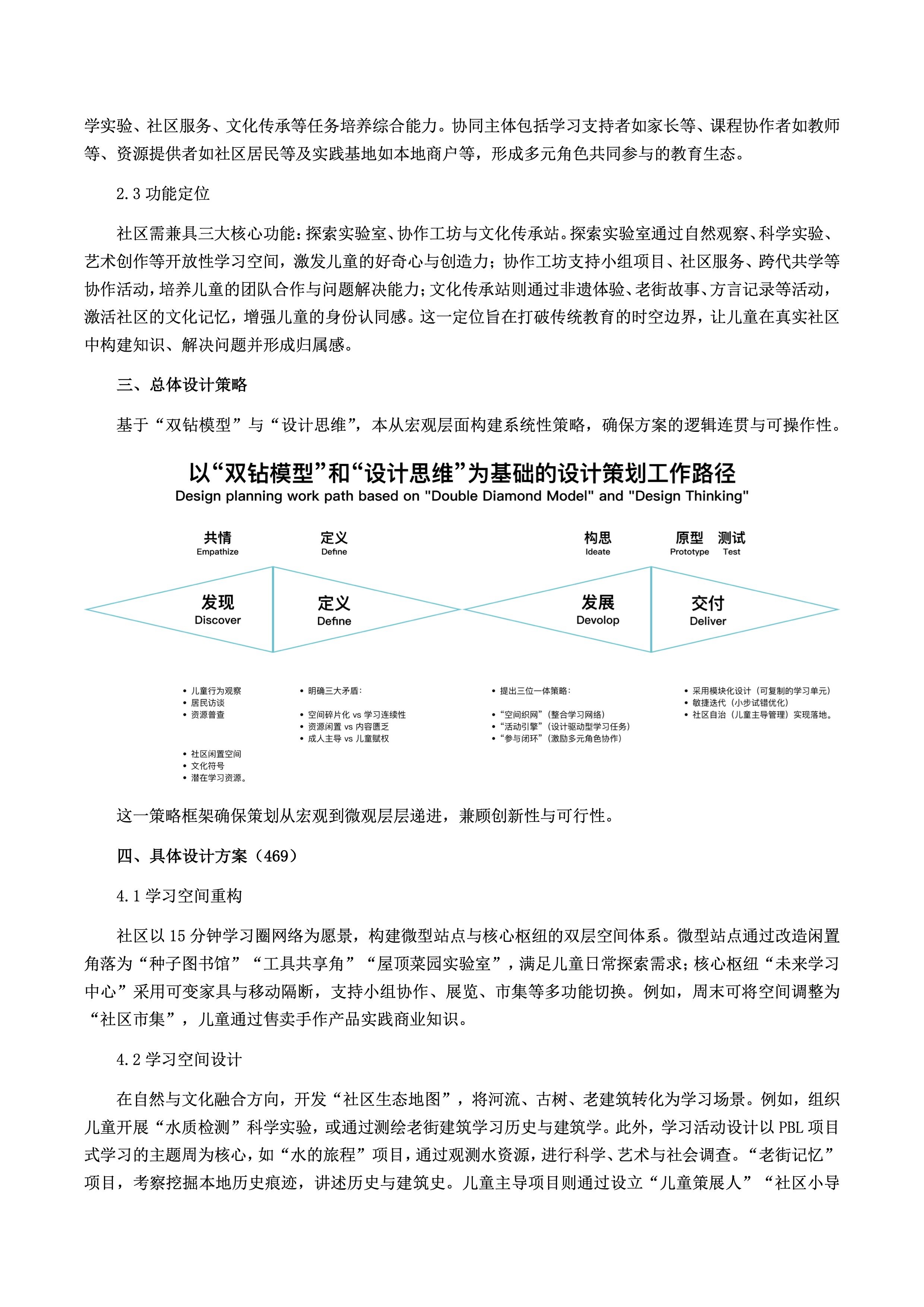 学实验、社区服务、文化传承等任务培养综合能力。协同主体包括学习支持者如家长等、课程协作者如教师 等、资源提供者如社区居民等及实践基地如本地商户等,形成多元角色共同参与的教育生态。 2.3功能定位 社区需兼具三大核心功能:探索实验室、协作工坊与文化传承站。探索实验室通过自然观察、科学实验、 艺术创作等开放性学习空间,激发儿童的好奇心与创造力;协作工坊支持小组项目、社区服务、跨代共学等 协作活动,培养儿童的团队合作与问题解决能力;文化传承站则通过非遗体验、老街故事、方言记录等活动, 激活社区的文化记忆,增强儿童的身份认同感。这一定位旨在打破传统教育的时空边界,让儿童在真实社区 中构建知识、解决问题并形成归属感。 三、总体设计策略 基于“双钻模型”与“设计思维”,本从宏观层面构建系统性策略,确保方案的逻辑连贯与可操作性。 以“双钻模型”和“设计思维”为基础的设计策划工作路径 Design planning work path based on "Double Diamond Model" and "Design Thinking" 共情 定义 构思 原型 测试 Empathize Define Ideate Prototype Test 发现 定义 发展 交付 Discover Define Devolop Deliver ·儿童行为观察 ·明确三大矛盾: ·提出三位一体策略: ·采用模块化设计(可复制的学习单元) ·居民访谈 ·敏捷迭代(小步试错优化) ·资源普查 ·空间碎片化vs学习连续性 ·“空间织网”(整合学习网络) ·社区自治(儿童主导管理)实现落地。 ·资源闲置 vs 内容匮乏 ·“活动引擎”(设计驱动型学习任务) ·成人主导 vs 儿童赋权 ·“参与闭环”(激励多元角色协作) ·社区闲置空间 ·文化符号 ·潜在学习资源。 这一策略框架确保策划从宏观到微观层层递进,兼顾创新性与可行性。 四、具体设计方案(469) 4.1学习空间重构 社区以15分钟学习圈网络为愿景,构建微型站点与核心枢纽的双层空间体系。微型站点通过改造闲置 角落为“种子图书馆”“工具共享角”“屋顶菜园实验室”,满足儿童日常探索需求;核心枢纽“未来学习 中心”采用可变家具与移动隔断,支持小组协作、展览、市集等多功能切换。例如,周末可将空间调整为 “社区市集”,儿童通过售卖手作产品实践商业知识。 4.2学习空间设计 在自然与文化融合方向,开发“社区生态地图”,将河流、古树、老建筑转化为学习场景。例如,组织 儿童开展“水质检测”科学实验,或通过测绘老街建筑学习历史与建筑学。此外,学习活动设计以PBL项目 式学习的主题周为核心,如“水的旅程”项目,通过观测水资源,进行科学、艺术与社会调查。“老街记忆” 项目,考察挖掘本地历史痕迹,讲述历史与建筑史。儿童主导项目则通过设立“儿童策展人”“社区小导