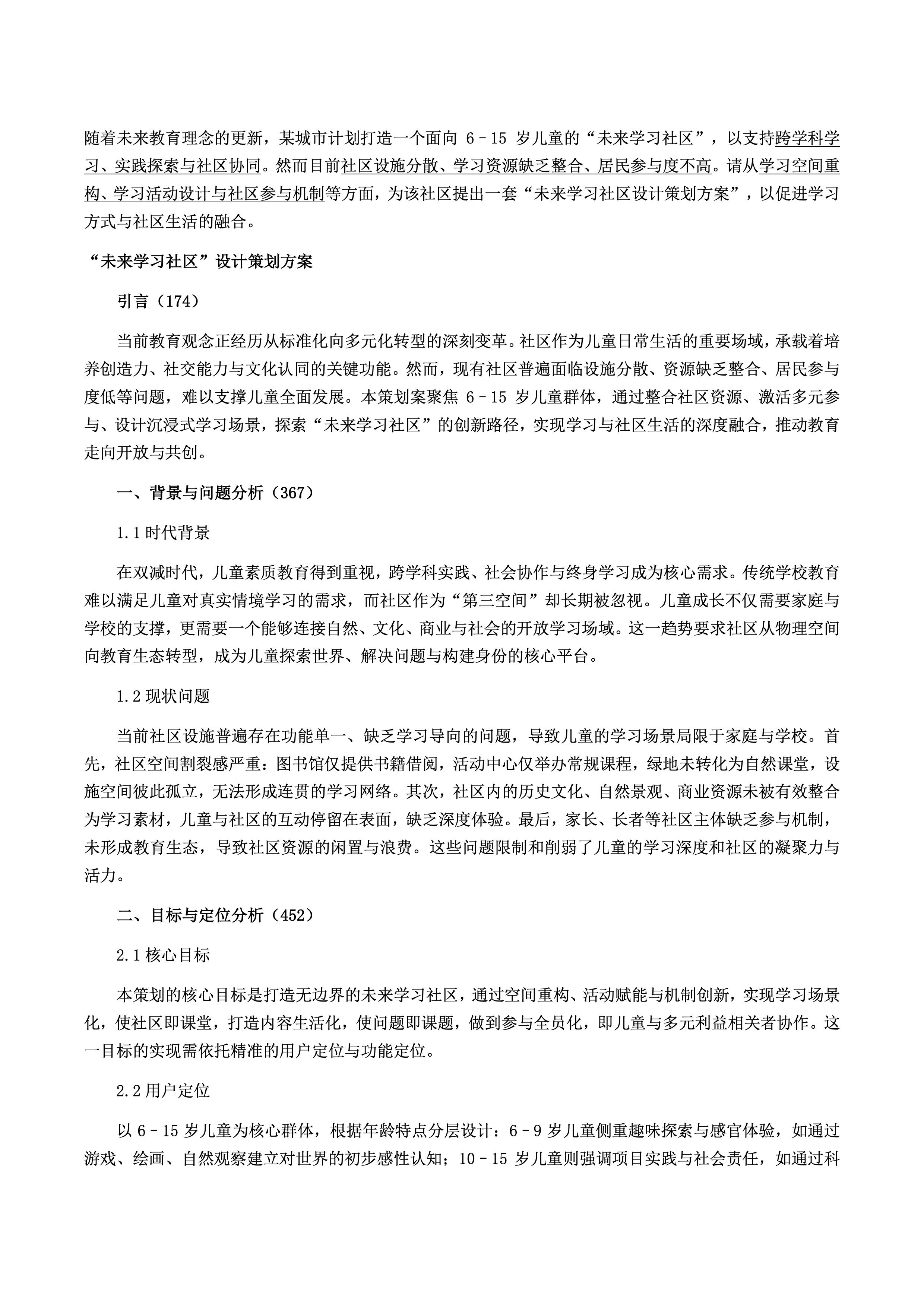 随着未来教育理念的更新,某城市计划打造一个面向6-15岁儿童的“未来学习社区”,以支持跨学科学 习、实践探索与社区协同。然而目前社区设施分散、学习资源缺乏整合、居民参与度不高。请从学习空间重 构、学习活动设计与社区参与机制等方面,为该社区提出一套“未来学习社区设计策划方案”,以促进学习 方式与社区生活的融合。 “未来学习社区”设计策划方案 引言(174) 当前教育观念正经历从标准化向多元化转型的深刻变革。社区作为儿童日常生活的重要场域,承载着培 养创造力、社交能力与文化认同的关键功能。然而,现有社区普遍面临设施分散、资源缺乏整合、居民参与 度低等问题,难以支撑儿童全面发展。本策划案聚焦6-15岁儿童群体,通过整合社区资源、激活多元参 与、设计沉浸式学习场景,探索“未来学习社区”的创新路径,实现学习与社区生活的深度融合,推动教育 走向开放与共创。 一、背景与问题分析(367) 1.1时代背景 在双减时代,儿童素质教育得到重视,跨学科实践、社会协作与终身学习成为核心需求。传统学校教育 难以满足儿童对真实情境学习的需求,而社区作为“第三空间”却长期被忽视。儿童成长不仅需要家庭与 学校的支撑,更需要一个能够连接自然、文化、商业与社会的开放学习场域。这一趋势要求社区从物理空间 向教育生态转型,成为儿童探索世界、解决问题与构建身份的核心平台。 1.2现状问题 当前社区设施普遍存在功能单一、缺乏学习导向的问题,导致儿童的学习场景局限于家庭与学校。首 先,社区空间割裂感严重:图书馆仅提供书籍借阅,活动中心仅举办常规课程,绿地未转化为自然课堂,设 施空间彼此孤立,无法形成连贯的学习网络。其次,社区内的历史文化、自然景观、商业资源未被有效整合 为学习素材,儿童与社区的互动停留在表面,缺乏深度体验。最后,家长、长者等社区主体缺乏参与机制, 未形成教育生态,导致社区资源的闲置与浪费。这些问题限制和削弱了儿童的学习深度和社区的凝聚力与 活力。 二、目标与定位分析(452) 2.1核心目标 本策划的核心目标是打造无边界的未来学习社区,通过空间重构、活动赋能与机制创新,实现学习场景 化,使社区即课堂,打造内容生活化,使问题即课题,做到参与全员化,即儿童与多元利益相关者协作。这 一目标的实现需依托精准的用户定位与功能定位。 2.2用户定位 以6-15岁儿童为核心群体,根据年龄特点分层设计:6-9岁儿童侧重趣味探索与感官体验,如通过 游戏、绘画、自然观察建立对世界的初步感性认知;10-15岁儿童则强调项目实践与社会责任,如通过科