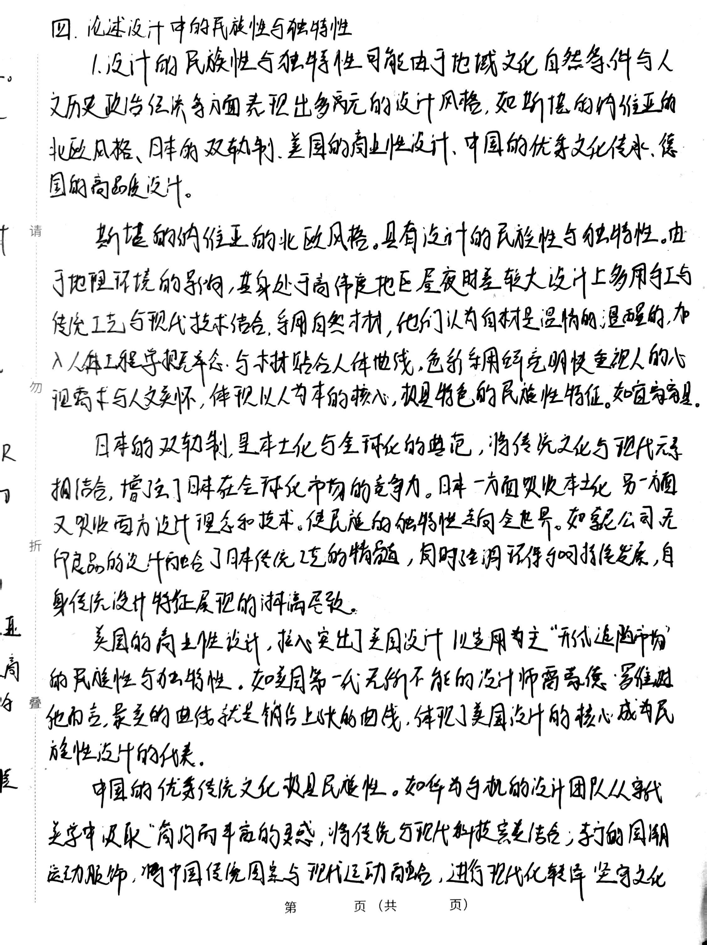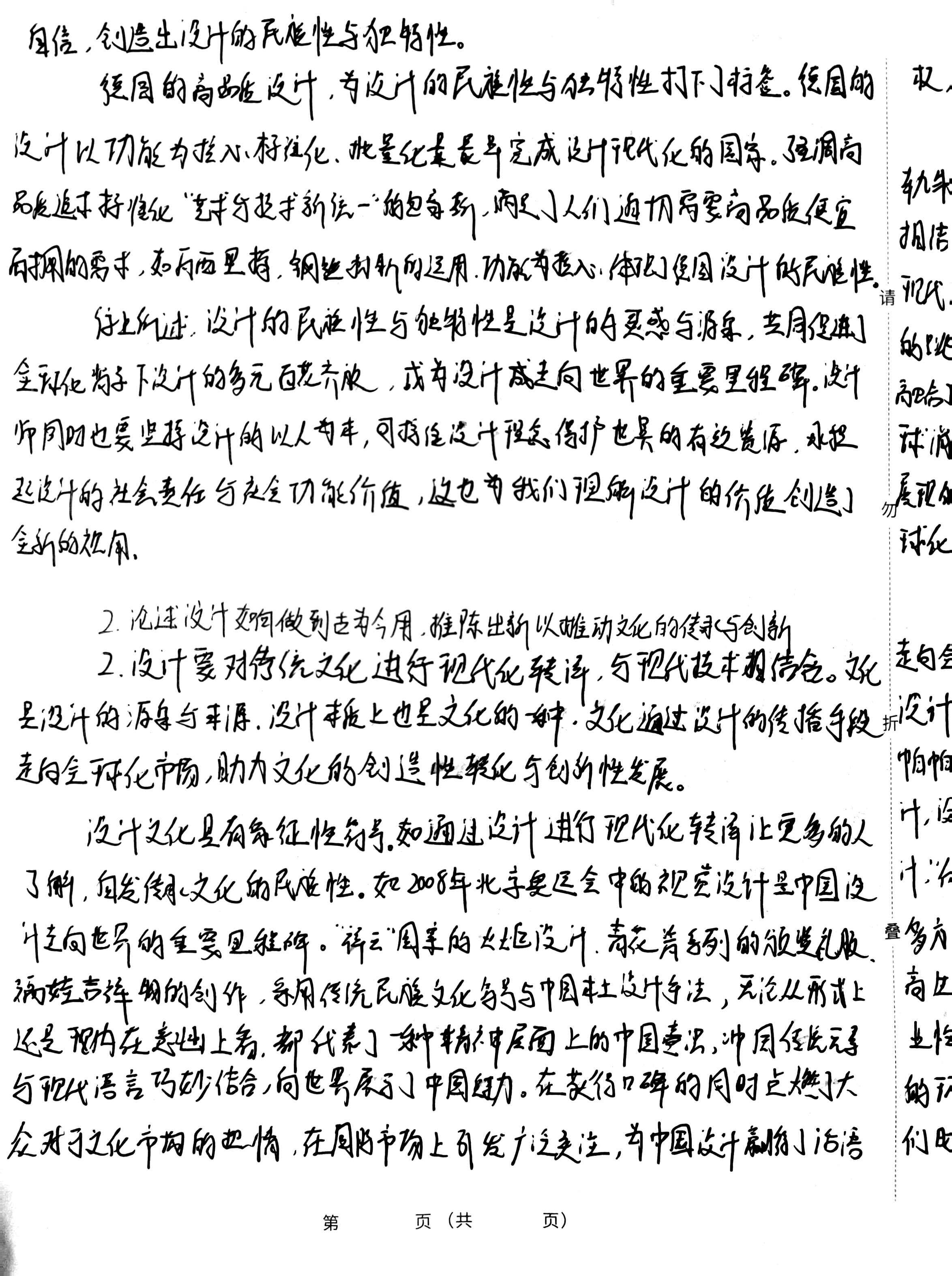 自信,创造出设计的民族性与独特性。 德国的商品质设计,为设计的民族性与独特性打下了标签。德国的 权 设计以功能为核心标注化,批量化量最早完成总计现代化的国家,强调高 品质追求标准化“艺术与技术新统一”的包身新,商足了人们迫切需要高品质便宜 轨朱 相结 耐拥的需求,如向西里持,钢丝封新的运用,功能为核心,体现了强国设计的民族性, 请 现代 行上所述,设计的民族性与独特性是设计的灵感与源泉,共同促进了 的跳 全球化背景下设计的多元百花齐服,成为设计成走向世界的重要里程碑,设计 融合了 而同时也要坚持设计的以人为本,可持维设计理念保护世界的有效资源,承担 起设计的社会责任与社会功能价值,这也为我们理解设计的价质创造了 展现的 全新的视用。 球化 2.论述设计如何做到古为今用,推陈出新以推动文化的传承与创新 2.设计要对传统文化进行现代化转洋,与现代技术相结合。文化 走向会 是设计的源泉与平源,设计本质上也是文化的一种,文化通过设计的传播手段 设计 走向全球化市场,助力文化的创造性转化与创新性发展。 帕帕 设计文化具有象征性符号。如通过设计进行现代化转译让更多的人 叶,设 了解,自发传承文化的民族性。如2008年北京奥运会中的视赏设计是中国设 什走向世界的重要是程碑。洋云“国家的火炬设计,青花青系列的颁览礼服 叠 多方 福娃言祥物的创作,采用传统民族文化等号与中国本土设计手法,无论从形式上 高生 还是内在意出上看,都代表了一种精神层面上的中国意识,中国传统元素 业怡 与现代语言巧妙结合,向世界展示了中国魅力。在获得口碑的同时点燃了大 的环 众对于文化市场的热情,在国际市场上引发广泛关注,为中国设计赢得了话语 们时 第 页(共 页)
