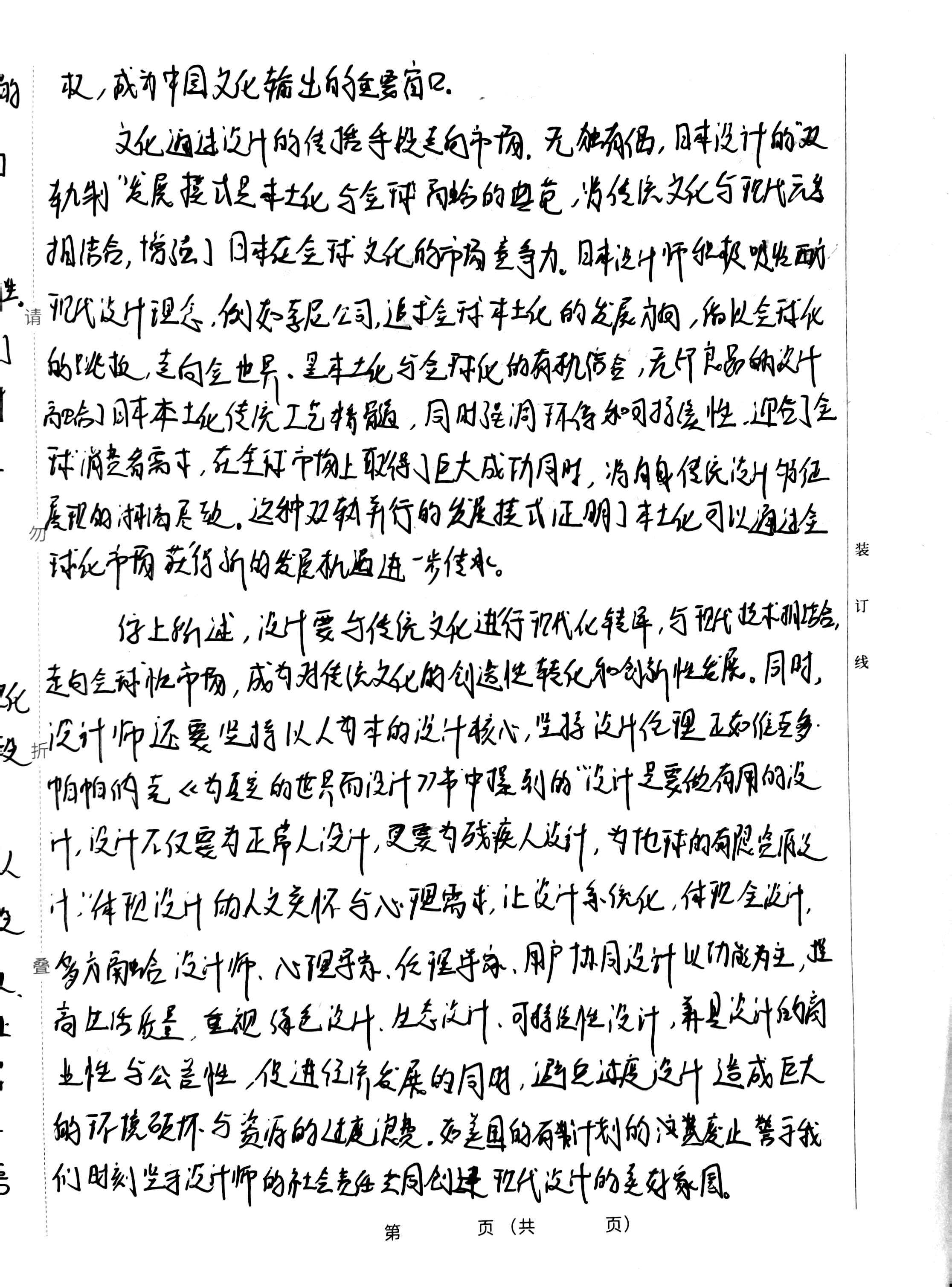 的 权,成为中国文化输出的重要窗口。 文化通过设计的传播手段走向市场,无独有偶,日本设计的“双 轨制”发展模式是本土化与全球融合的典范,将传统文化与现代 相结合,增强了日本在全球文化的市场竞争力。日本设计师积极吸收西方 生 请 现代设计理念,例如系层公司,追求全球本土化的发展方向,借以全球化 的跳板,走向全世界,是本土化与全球化的有机结合,无印良品的设计 融合了日本本土化传统工艺精髓,同时强调环保和可持续性,迎合了全 球消费者需求,在全球市场上取得了巨大成功同时,将自身传统设计特征 展现的清尽致。这种双轨并行的发展模式证明了本土化可以通过金 球化市场获得新的发展机遇进一步传承。 装 际上所述,设计要与传统文化进行现代化转译,与现代技术相结合, 订 线 化 走向全球性市场,成为对传统文化的创造性转化和创新性发展。同时, 段折 设计师还要坚持以人为本的设计核心,坚持设计伦理正如维克多 帕帕纳克《为真实的世界而设计》书中提到的“设计是要做有用的设 人 计,设计不仅要为正常人设计,更要为残疾人设计,为地球的有限资源设 乏 计“体现设计的人文关怀与心理需求,让设计系统化,体现全设计, 1. 多方融合设计师,心理学家,伦理学家,用户协同设计以功能为主,提 上 高生活质量,重视绿色设计,生态设计,可持续性设计,并是设计的商 业性与公益性,促进经济发展的同时,避免过度设计造成巨大 的环境破坏与资源的过度浪费。如美国的有计划的废止警于我 5 们时刻坚于设计师的社会责任共同创建现代设计的美好家园。 第 页(共 页)