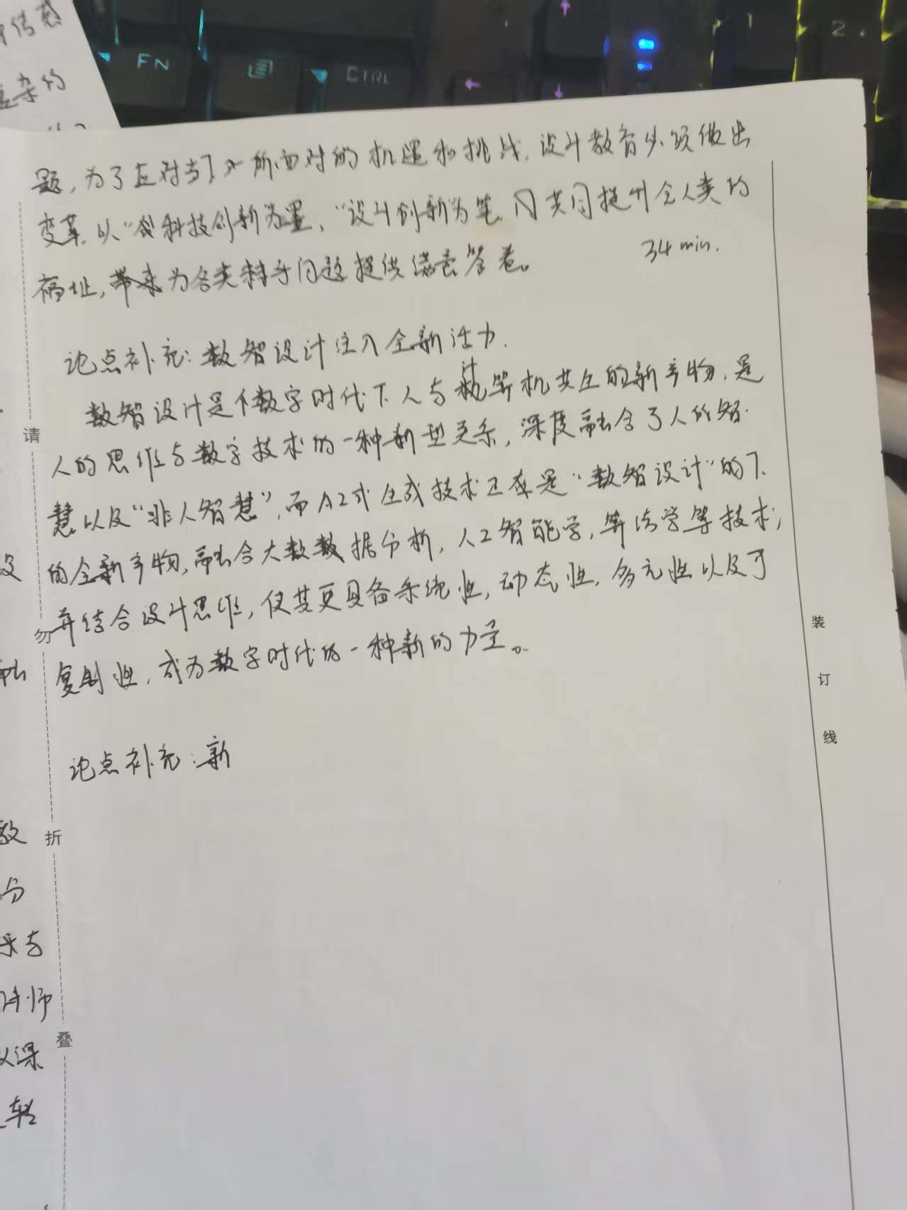 传 杂竹 FN CIRL 题,为了应对当了所面对的机遇和挑战,设计教育必须做出 变革,以“科技创新为置,“设计创新为笔,共同提升令人类的 福址,为各类手问题提供满意答卷。 34min. 论点补充:数智设计注入全新活力 请 数智设计是个数字时代下人与执等机共生的新产物,是 人的思维与数字技术的一种新型关系,深度融合了人所智 慧以及“非人智慧”,而A2式生成技术正是“数智设计”的7 的全新产物,融合大数数据分析,人工智能学,算结学等技术; 并结合设计思作,使其更具备系统性,动态性,多元性以及可 ph 复制性,成为数字时代的一种新的力量。 装 订 论点补充:新 线 折 分 师 从课 转