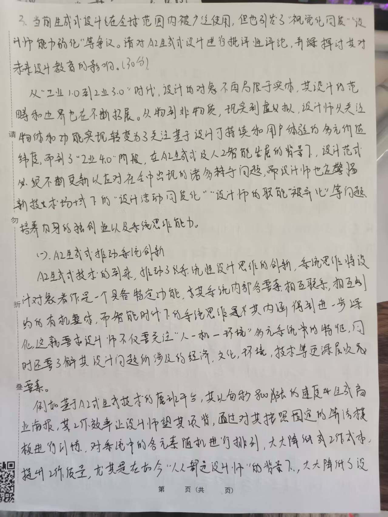 3.当前生成式设计在全球范围内被广泛使用,但也引发了“视觉化同质”“设 计师能力的化“等争议。请对A2且成式设计进行批评性评论,并挥讨共对 未来设4教育的影响。(30分)( 从“工业1.0到工业3.0”时代,设计的对象不再局限于实体,其设计的范 畴和边界也在不断拓展。从物到非物质,现实到虚拟,设计师从关注 请 物体和功能实现转变为了关注基子设计可持续和用户体验的多元价值 纬度,而到了“2业4.0”阶段,在A2生成式及人工智能发展的背景下,设计范式 必须不断更新以应对社会中出现的诸多棘手问题,而设计师也应警惕 新技术场域下的“设计活动同质化”“设计师的职能“被异化”等问题 勿 培养内身的独创业以及系统思维能力。 (一).A2生成式推动系统创新 2生成式技术的到来,推动了系统性设计思维的创新,系统思维将设 计对象者作是一个具备特定功能,其系统内部各要素,相互联系,相互的 约的有机整体,而智能时代下的系统思是其内涵得到进一步深 化,这就要求设计师不仅要关注“人一机-环境”多元系统的特征,月 时还要了解其设计问题所涉及的经济、文化,环境,技术等更深层次 要素。 例如基于A2式生产技术的鹿班平台,其以每秒800涨的速度生成高 业海报,工作效率让设计师望其项背,通过对其按照固定的算法模 板进行训练,对系统中的各元素随机进行排列,大大降低成工作成本, 提升工作质量,尤其是在如今“人人都是设4师”的背景下,大大降低了设 8 第 页(共 页)