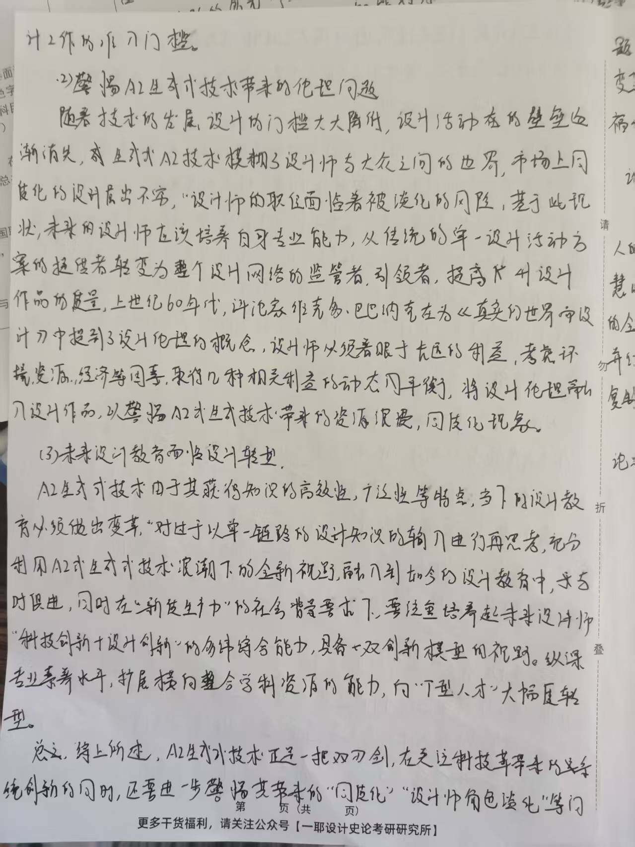 从外元 计工作的准入门槛。 题 面 2)警惕AI生成式技术带来的伦坦问题 变 字 料 ) 随着技术的发展,设计的门槛大大降低,设计活动在的壁垒边 福 渐消失,成生成式AI技术模糊了设升师与大众之间的世界,市场上月 2 总 质化的设计层出不穷,“设计师的职位面临着被淡化的风险,基于此现 请 国1 状;未来的设计师应该培养自身专业能力,从传统的单一设计活动方 人的 案的提供者转变为整个设H网络的监管者,引领者,提高升设计 慧 作品的质量,上世纪60年代,许论家作克多、巴巴内克在为《真实的世界而没 的全 计》中提到了设计伦理的概念,设计师必须看眼于长远的利益,考虑环 并 境,资源,经济等因素,取得几种相关利益的动态平衡,将设计伦理融 复制 入设计作品,以警惕A2式生成技术带来的资源浪漫,同质化现象 (3)未来设计教育面临设计转型. 论 AI生成式技术由于其获得知识的高效性,广泛性等特点,当下所设计教 折 育必须做出变革,“对过于以单一链路的设计知识的输入进行再思考,充分 利用A2或生成式技术浪潮下的全新视野,融入到如今的设计教育中,与 时俱进,同时在“新质生产力”的社会背景要求下,要注重培养起未来没律师 “科技创新+设计创新”的多伟符合能力,具备一双创新模型的视野。纵深 叠 专业素养水平,扩展横向整合学科资源的能力,向“T型人才”大幅度转 型。 总,穿上所述,AI生成习技术正是一把双刃剑,在关注科技革带来的安系 统创新的同时,还要进一步警惕共带来的“同传化”“设计师角色淡化”等闪 第 页) 更多干货福利,请关注公众号[一耶设计史论考研研究所]