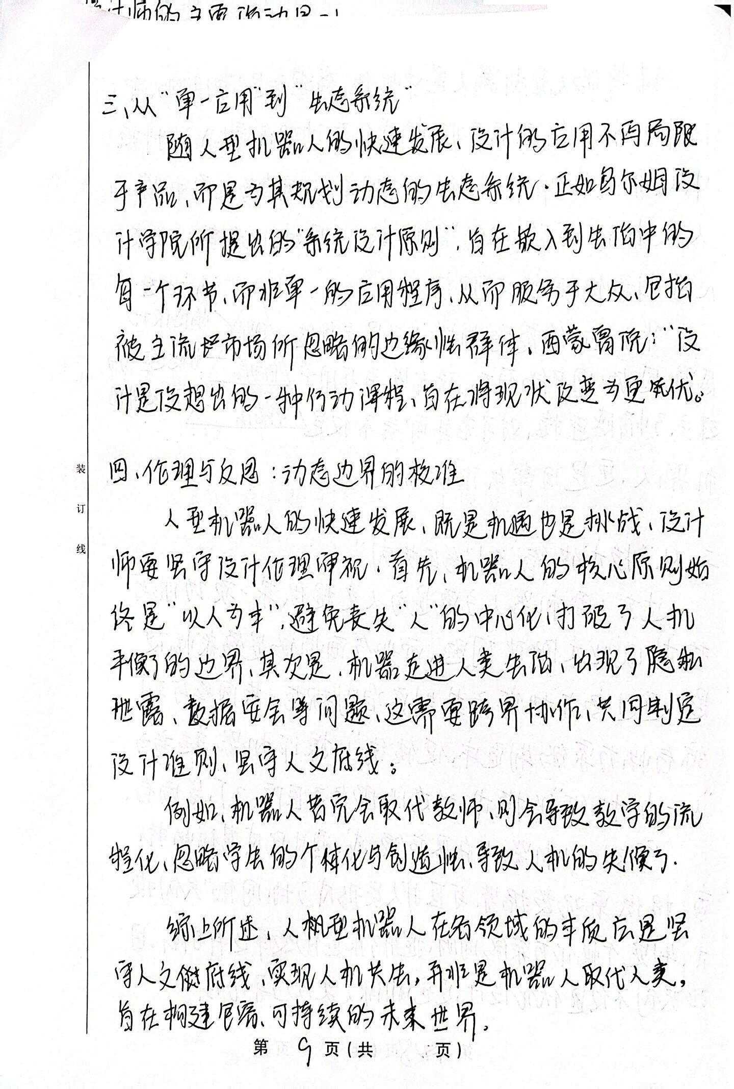 四,思辩与反思 纯粹的人型机器人是中性所,畜甚至是“盲目”的,而 AI生成式设计在解释生产力的同时,也引发了一系列深 设计的核心价值在于将情感化设计理念融入到科技 层危机,首先是设计师主体性危机、从过去的创新、审要等创 中、从而使其拥有人性化与伦理导向,充争了人型机器 造性能力弱化、成为AI工具的操作者,而设计师如何在人机 人“人性化”与“社会化”的桥梁。正是对北欧重视人类 协作中把握主权仍是一大难题,其次是跨学科的整合转 心理因素的承接与响应 内心共建, 泽,并非是对表象的拼接,而是深入理解以此培养学生对于 华为设计的憋能机器人正是全身传 反思君 情感依托 文化符号与重构的创新能力、以此拥抱设计的人文精神 感器感知用户的存在,清气等,并与用户 行为层 情感交互行为 温暖外形 综上所述、AI生成式设计既是挑战,也是契机、未来没 建立了情感连接,对于老年而言不仅是 本能层 计教育构建社会.科学、人文、伦理等多维度体系,在驾驶 勿 机器人、更是日常失的家人 装 订 科技的同时,走向人机共生的可持续未来。 二、从“技术供给”到“参与共创 线 过去人型机器人主要是为人类提供某一项功能与 2.请从“设计伦理角度,评论人形机器人在养无、医疗、教育 技术,以此来解决问题,而如今面临的是复杂性仪 等敏感场景中的使用边界 5 题,通过多方协作为其制定准则规范,共同参与到 答: : 从工业革命1.0迈向4.0的进程中、传统的设计理 综合性方案的制定中,使传统“人操作机器转变为 念逐渐被数字化工具与智能科技所替代,推动着及 人一机协作的模式、动态的服务于医院、工厂等场合、 计范式的变革,而人工智能的发展并不止步于虚拟空间。 宇树G7I机器人在医疗领域,通过完成基础性格 进而迈向了人型机器人的新纪元,影响着生治各方面。 叠 查,提供客观数据等与医护人员形成了协同的“共创换 式、制定个性化方案的同时、提升了康复的效率及科学性。因 一、从“理性工具”到“情感感知“ 此共创不仅是优化设计,更是确保人类的主导地位, 4 第 1页(共 页)