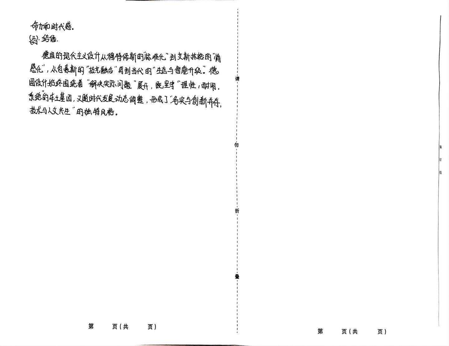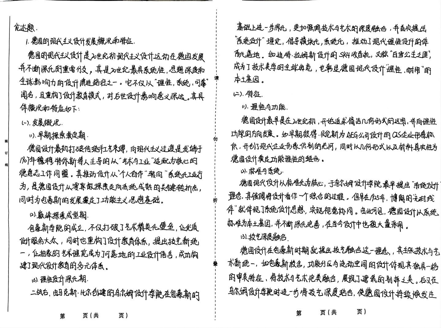 论述题 基础上进一步深化,更加强调技术与艺术的深度融合,并首次提出 1.德国的现代主义设计发展概况和特征。 系统设计”理论,倡导模块化,系统化,推动了现代理性设升的体 德国的现代主义设计是20世纪初现代主义设计运动在德国发展 系化落地。如迪特.拉姆斯设计的SK4收音机,又称“白雪公主之通”, 并不断深化的重要行支,其是20世纪最具系统性,思想深度和 成为了技术美学的全球典范,也彰显德国现代设计“理性,耐用”的 全球影响力的设什演进路径之一.它不仅以“理性,系统,可靠” 本土基因。 闻名,且重构了设计教育模式,对后世设计影响意义深远。 (二)特征, 体概况和特征如下: (1)理性与功能 (一)发展概况, 德国设升最早是在20世纪初,开始追求简洁几何形式的运用,并向理性 (1)早期探索奠定期( 勿 功能的方向发展。如早期彼得.贝伦斯为AEG公司设升的CIS企业形象标 装 德国设计最初打破传统手工艺束缚,向现代主义过渡是发端于 织,开创了现代企业形象识别的先河,同时以几何形式以及材料真实性为 订 德国设计奠定功能理性的雏形。 线 1907年穆特休斯等人主导的以“艺术与工业"适配为核心的 德意志工作同盟。其推动设升从“个人创作”转向“系统化工业行 (2)标准与系统 为,是德国设升从零散探索走向系统成熟的关键转折点, 德国现代设计以标准化为核心,于乌尔姆设升学院最早提出“系统设升 同时为包象斯的发展奠定了功能主义思想基础。 折 理念,其强调将设计看作一个综合的过程。但早在1925年,博朗的“无衬线 体”就体现了系统设什思想,实现视觉协同。由此可见,德国设计以系统 (2)巅峰探索成型期 包象斯学院的成立,不仅打破了艺术精英化壁垒,让优质 标准为本土基因,并不断深化完善,在当今设计中也被大量采用。 设计服务大众,同时也重构了设升教育体系,提出技艺新统 (3)技艺深度融合 一,让抽象的艺术理论成为了可落地的工业设什语言,成功构 德国设升在包豪斯时期就提出技艺融合这一理念,其主张技术与艺 建了现代设计教育的多元体系, 术新统一,如包象斯校舍,功能分区与流动空间的设升体现其独具一格 (3)理性设计深化期 的审美特征,将技术与艺术完美融合,展现了建筑的别样之美。后又在 二战后,由马克斯.比尔创建的乌尔姆设计学院在包象斯的 尔尔姆设升学院时进一步将技艺深度结合,使德国设计持续焕发生 第 页(共 页) 第 页(共 页) 命力和时代感。 三)结语 德国的现代主义设计从穆特修斯的“标准化”到艾斯林格的“情 感化”,从包豪斯的“技艺融合“再到当代的“生态与智能升级”。德 国役计始终围绕着 “解决实际问题”展开,既坚守“理性,耐用。 系统的本土基因,又随时代发展动态调整,形成了“务实与创新并存 技术与人文共生”的独特风格。 勿 装 订 登 第 页(共 页) 第 页(共 页)