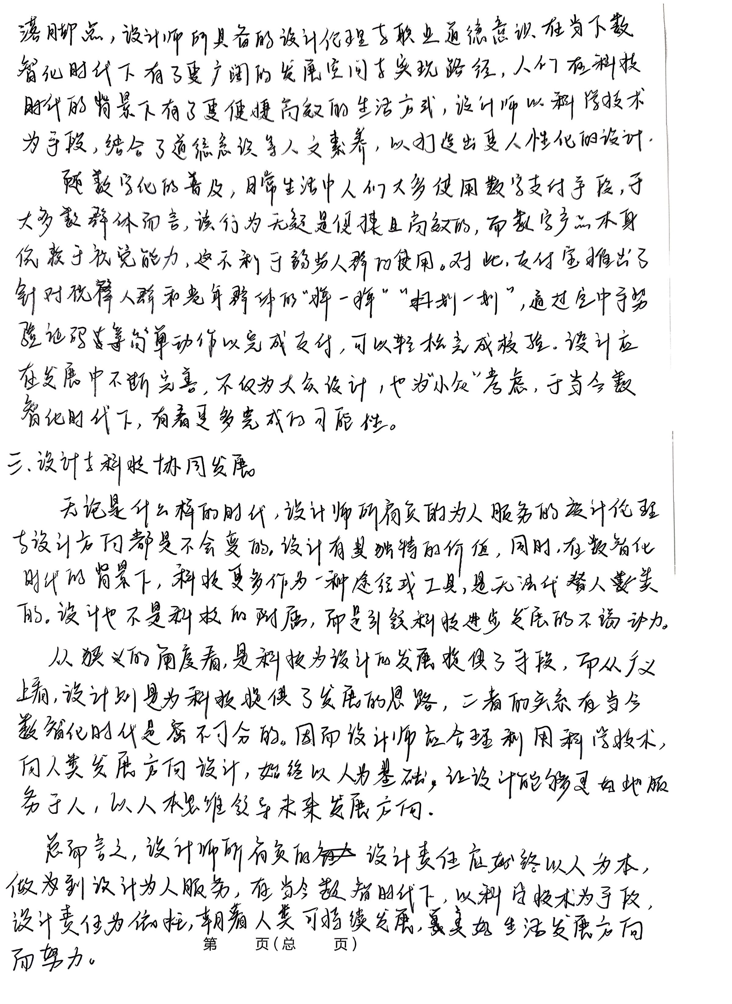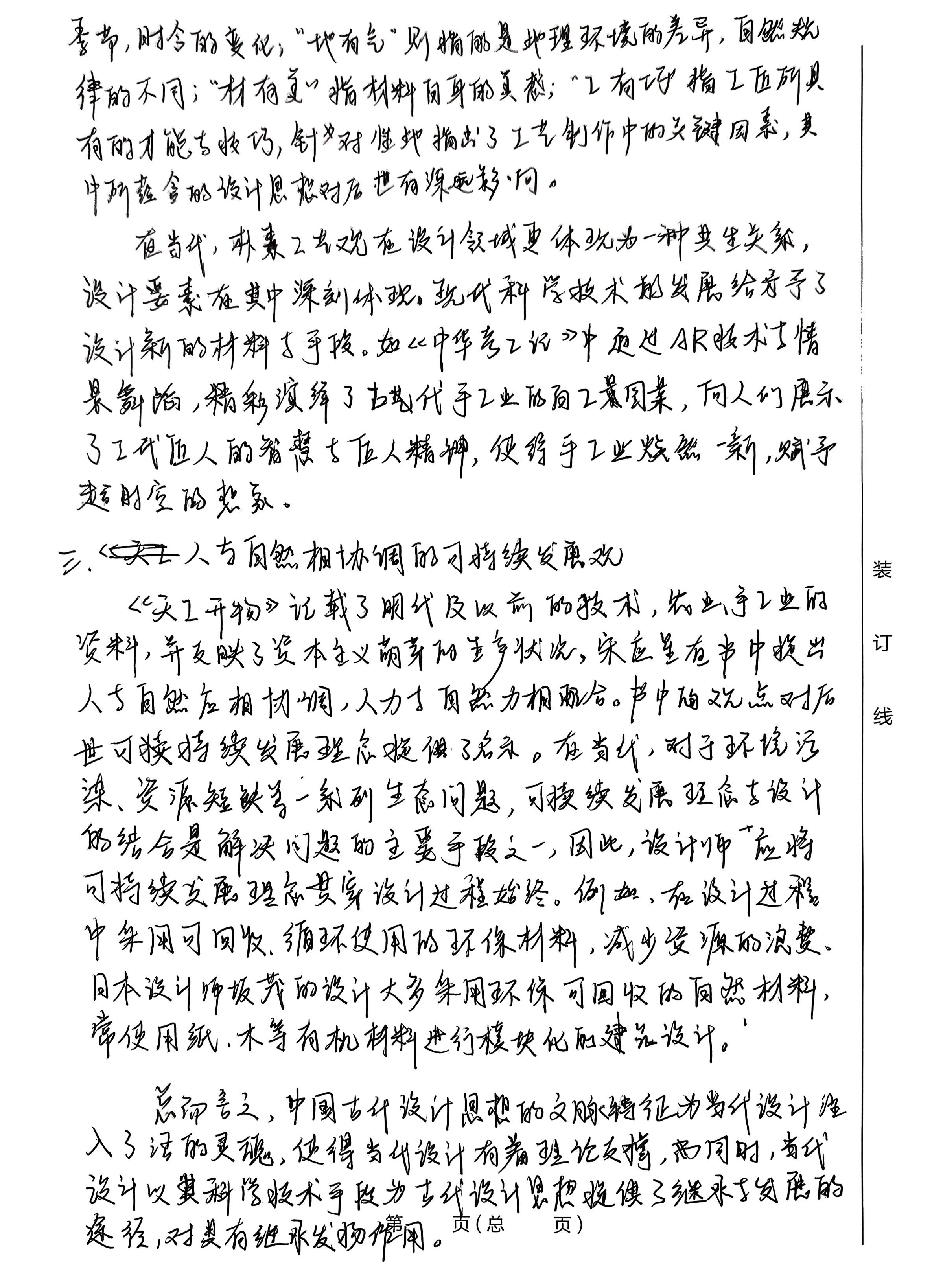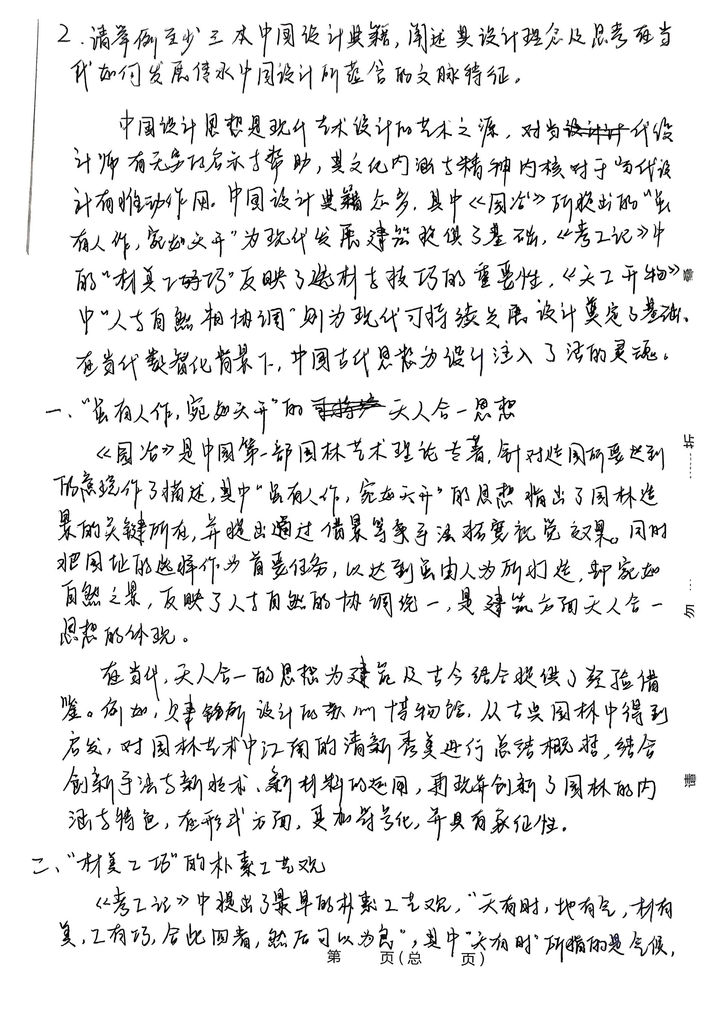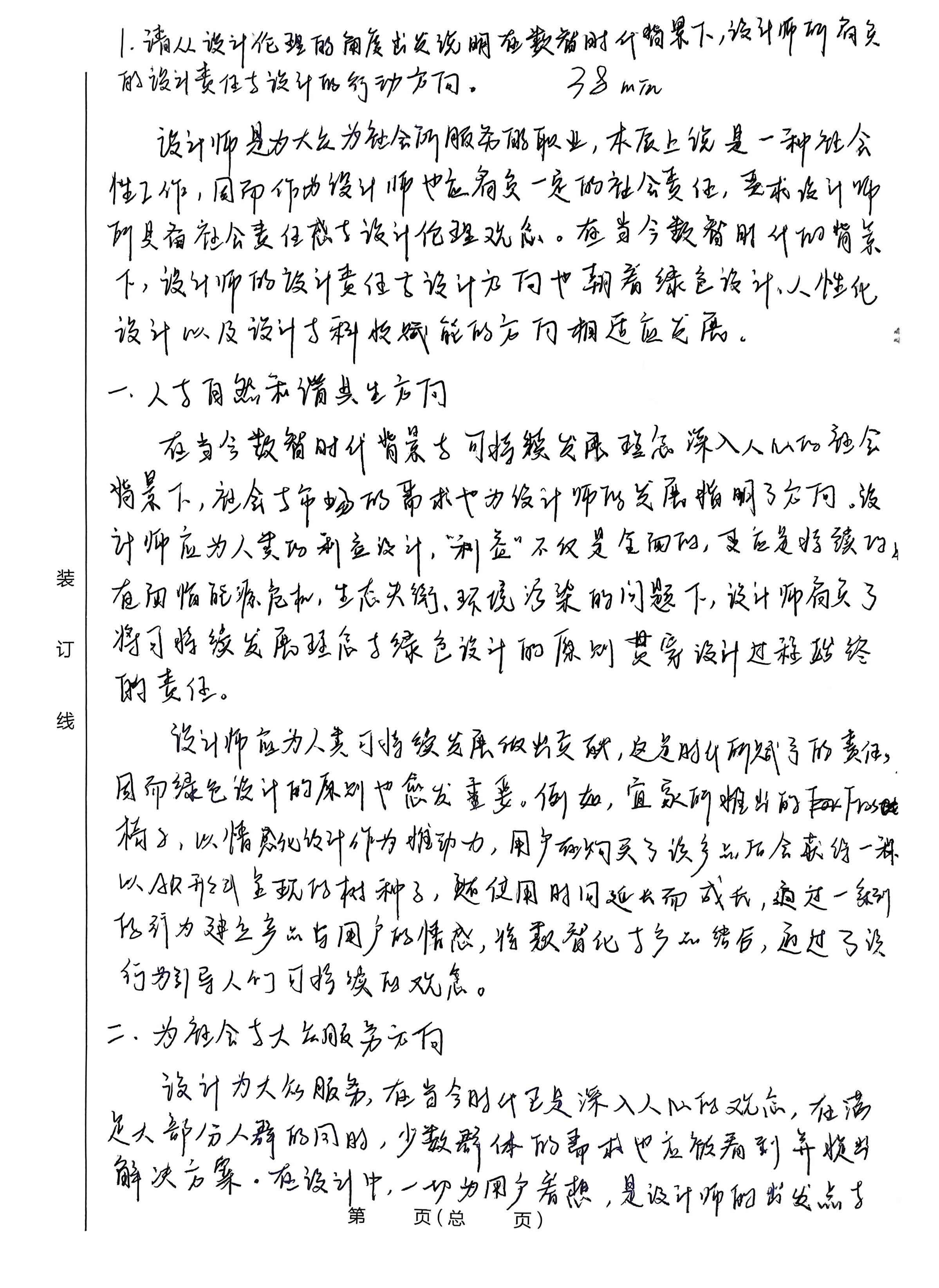 .请从设计伦理的角度出发说明在数智时代背景下,设计师所肩负 的设计责任与设计的行动方向。 38n min 设计师是为大众为社会所服务的职业,本质上说是一种社会 性工作,因而作为设计师也应有负一定的社会责任,要求设计师 所具备社会责任感与设计伦理观念。在当今数智时什的背景 下,设计师的设计责任与设计方向也朝着绿色设计,人性化 设计以及设计与科技赋能的方向相适应发展, 一.人与自然和谐其生方向 在当今数智时代背景与可持续发展理念深入人心的社会 背景下,社会与市场的需求也为设计师的发展指明了方向。设 计师应为人类的利益设计,“利益”不仅是全面的,应是持续的 装 直面临能源危机,生态失衡,环境污染的问题下,设计师肩负了 订 将可持续发展理念与绿色设计的原则贯穿设计过程始终 的责任。 线 设计师应为人类可持续发展做出贡献,这是时代所赋予的责任, 因而绿色设计的原则也愈发重要。例如,宜家所推出的Fros 椅子,以情感化设计作为推动力,用户在购买了该产品后会获得一 以AR形成呈现的树种子,随使用时间延长而成长,通过一系列 存行为建立产品与用户的情感,将数智化与产品结合,通过了该 行为引导人们可持续的观念。 二,为社会与大众服务无向 设计为大众服务,在当今时代正是深入人心的观念,在满 定大部分人群的同时,少数群体的需求也应被看到并提出 解决方案。在设计中,一切为用户着想,是设计师的出发点与 第 页(总 页) 落脚点,设计师所具备的设计伦理与职业道德意识在当下数 智化时代下有了要广阔的发展空间与实现路径,人们在科技 时代的背景下有了更使捷高效的生活方式,设计师以科学技术 为手段,结合了道德意识等人文素养,以打造出受人性化的设计, 随数学化的普及,日常生活中人们大多使用数学支付手段,于 大多数群体而言,该行为无疑是便捷且高效的,而数字产品本身 优赖于视觉能力,这不利于弱另人群的使用。对此,支付宝推出了 针对祝伴人群和老年群体的“样一年”“计划一划”,通过空中手势 验证码等简单动作以完成支付,可以轻松光成较验。设计应 在发展中不断完善,不仅为大众设计,也为“小众”考虑,于当今数 智化时代下,有着更多完成的可能性。 三、设计与科技协同发展 无论是什么样的时代,设计师所肩负的为人服务的设计伦理 与设计方向都是不会变的,设计有具独特的价值,同时,在数智化 时代的背景下,科技更多作为一种途径或工具,是无法代替人类 的。设计也不是科技的附属,而是引领科技进步发展的不竭动力。 从狭义的角度看,是科技为设计的发展提供了手段,而从广义 上看,设计则是为科技提供了发展的思路,二者的关系有当今 数智化时代是密不初分的。因而设计师应合理利用科学技术, 务于人,以人本要维领导取人为基础,让设计能够建好地服 总而言之,设计师所有负的设计责任应始终以人为本, 做到设计为人服务,在当今数智时代下,以科学技术为手段, 设计责任为依托,朝着。 人类可持续发展,美好生活发展方向 而努力。 第 页(总 页) .请举例至少三本中国设计典籍,阐述其设计理念及思考在当 代如何发展传承中国设计所蕴含的文脉特征。 中国设计思想是现代艺术设计的艺术之源,对当代役 计师有无穷的启示与帮助,其文化内涵与精神内核对于当代设 计有推动作用。中国设计典籍众多,其中《国治》所提出的“虽 有人作,宛如天开”为现代发展建筑提供了基础,《考工记》中 的“材美工巧”反映了选材与技巧的重要性,《天工开物》 中“人与自然相协调“则为现代可持续发展设计奠定了基础。 在当代数智化背景下,中国古代思想为设计注入了活的灵魂。 一、“虽有人作,宛如天开”的天人合一思想 《园冶》是中国第一部国林艺术理论专著,针对造国所要达到 的院作了描述,其中“虽有人作,宛如天开”的思想指出了国林造 景的关键所在,并提出通过借景等手法拓宽视觉效果。同时 强由人为死 家如 自然之景,反映了十自然的协调统,是建设而天人。 思想的体现。 在当代,天人合一的思想为建筑及古今结合提供了经验借 鉴。例如:欠隶铭所设计的苏州博物馆,从古典国林中得到 启发,对园林艺术中江南的清新秀美进行总结概括,结合 创新手法与新技术,新材料的运用,再现并创新了园林的内 涵与特色,在形式方面,更加符号化,并具有象征性。 二、“材美工巧”的朴素工艺观 《考工记》中提出了最早的朴素工艺观,“天有时,地有气,材有 其,工有巧,合此四者,然后可以为良”,其中“天有时”所指的是气候 第 页(总 页) 季节,时令的变化;“地有气”则指的是地理环境的差异,自然规 律的不同;“材有变口指材料自身的灵感;“工有巧指工匠所具 有的才能与技巧,针对性地指出了工艺制作中的关键因素,其 中所蕴含的设计思想对后世有深远影响。 查当代,朴素工艺观在设计领域更体现为一种共生关系, 设计要素在其中深刻体现。现代科学技术的发展给与予了 设计新的材料与手段。如《中华考工记》中通过AR技术与情 景舞蹈,精彩演绎了古代手工业的白工园案,向人们展示 了工代选人的智慧与后人精神,使得手工业焕然一新,赋予 超时空的想象。 三、人与自然相协调的可持续发展观 装 《天工开物》记载了明代及以前的技术,农业手工业的 资料,并反映了资本主义萌芽的
